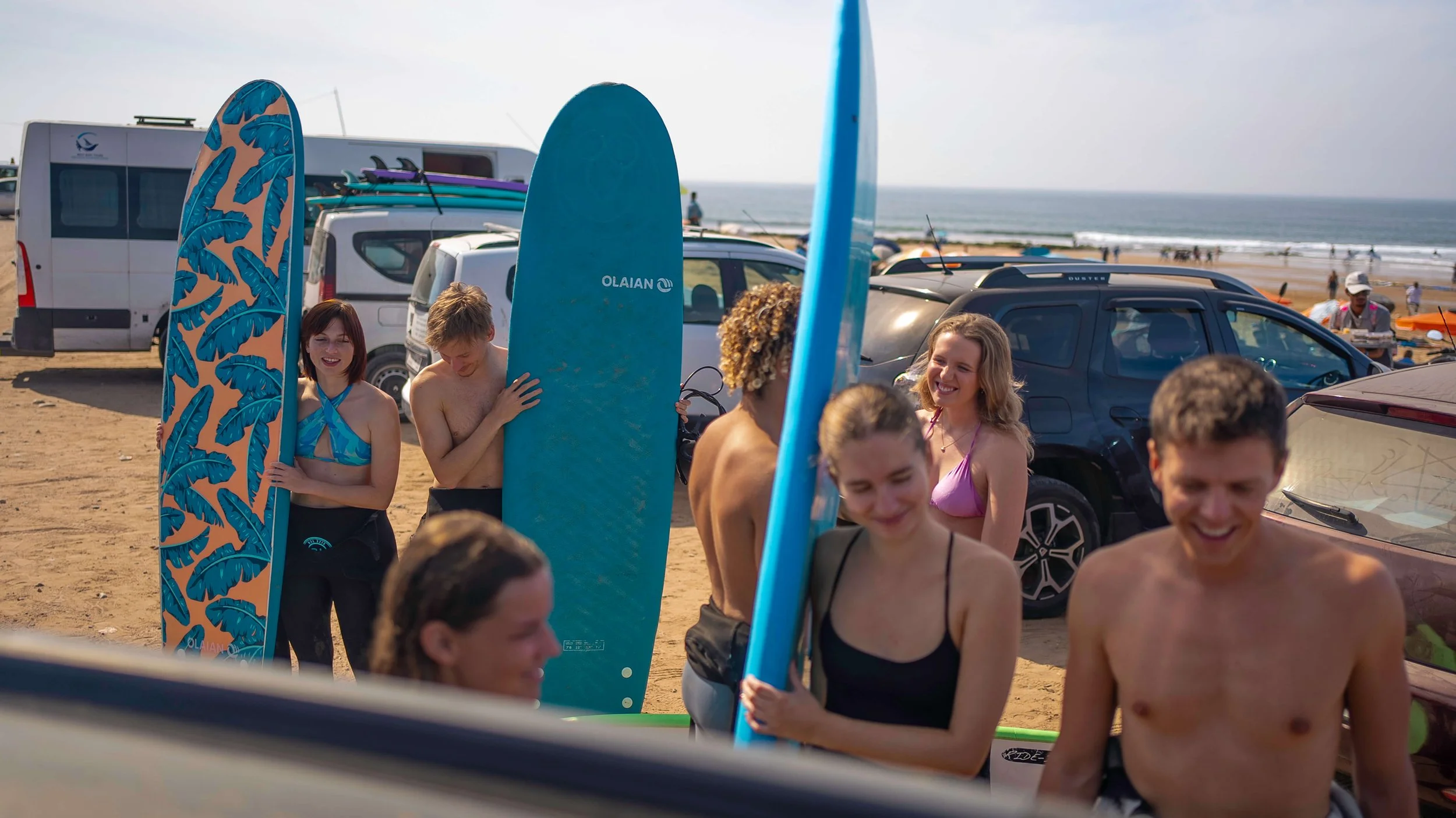 Getting ready for the surf session, all laughing together in unforgettable moments of friendship.